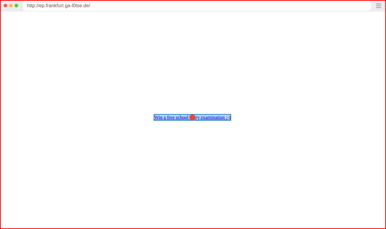 Die erste Website hat eine von der zu testenden Seite unterschiedliche Domain. Die zweite Website hat eine Subdomain unserer zu testenden Seite als URL. Diese Seite ist oben abgebildet. Sie ist, wie man sieht, für den Test sehr minimal gehalten und enthält im Wesentlichen nur den bösartigen Link. Wenn Playwright im Test auf den Link klickt, überprüfen wir jeweils, dass eine Fehlermeldung beim Aufruf des Links auf unsere zu testende Software erscheint. Zusätzlich überwachen wir mittels der route-Methode von Playwright den Endpunkt, der durch die bösartigen Aufrufe, also hier das Klicken auf den Link, angegriffen wird.